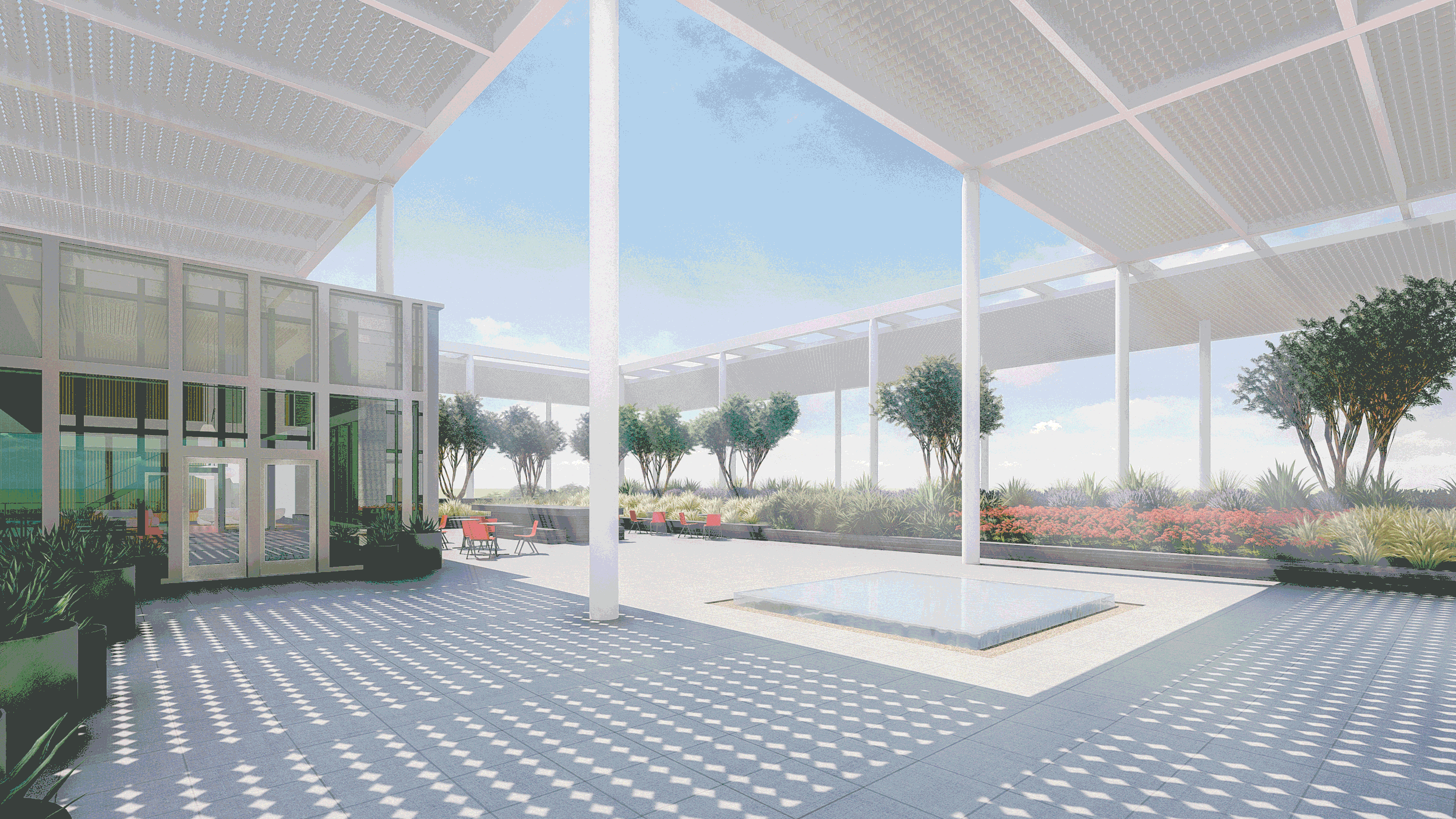 The site design emphasizes sustainability by maximizing the use of locally sourced, drought-tolerant plants and trees, minimizing the need for watering. Palapa shading on outdoor terraces ensures year-round comfort while reducing thermal load, and a large grove of mature trees has been preserved. The project is registered with Leadership in Energy and Environmental Design (LEED®) – a green building certification program that recognizes best-in-class building strategies and practices – and has a goal of Silver certification.